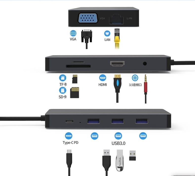 Uzyskaj wszechstronność i podłącz wszystko czego potrzebujesz do swojego urządzenia (np. myszkę, monitor, telefon, ładowarkę, karty SD, drukarkę, dyski zewnętrzne i wiele innych).